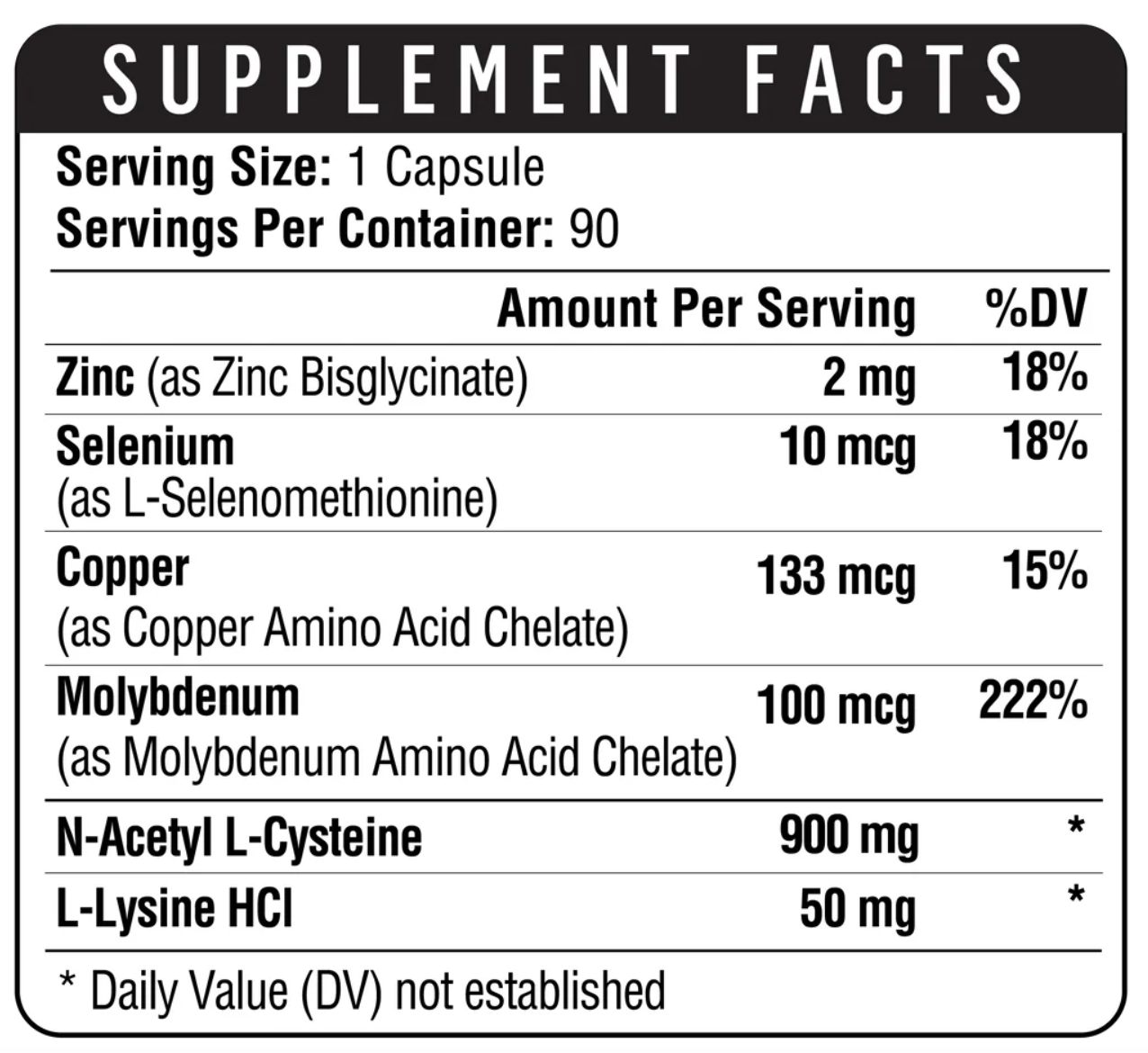 To further enhance NAC’s long-term effectiveness, the formula includes key trace minerals — selenium, molybdenum, zinc, and copper — along with L-lysine, which together support antioxidant enzyme activity, detoxification pathways, and immune defense.
